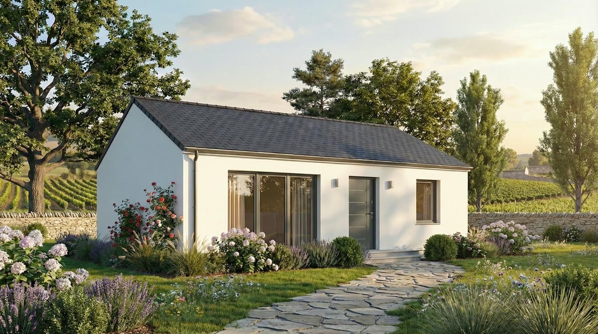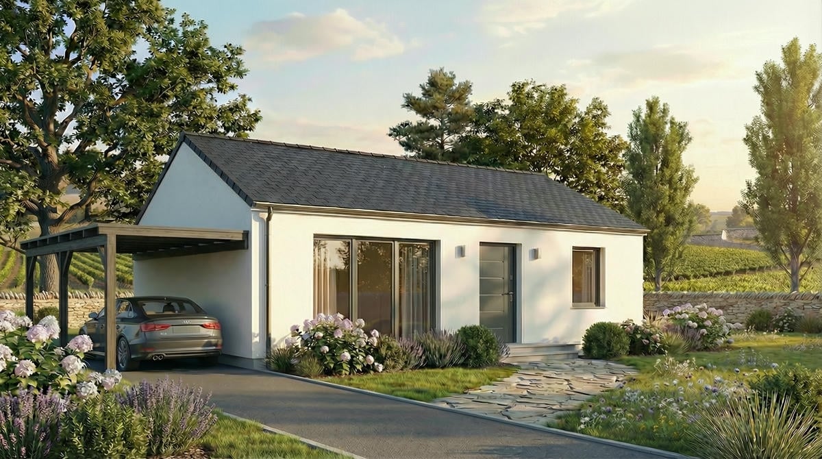 De plain-pied, la Access 70 facilite la circulation et s’adapte parfaitement aux terrains de dimensions variées. Son architecture sobre et efficace, avec tuiles béton ardoisées, enduit gratté beige et menuiseries PVC blanches lui confère un style intemporel et harmonieux.