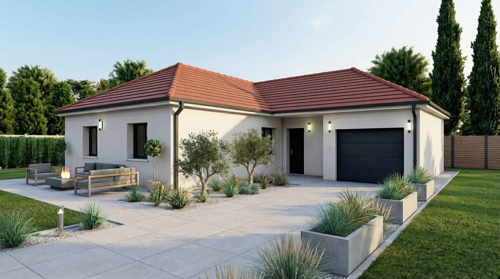 Maison en « L », elle s’affiche en version 3 chambres avec cellier et garage.
