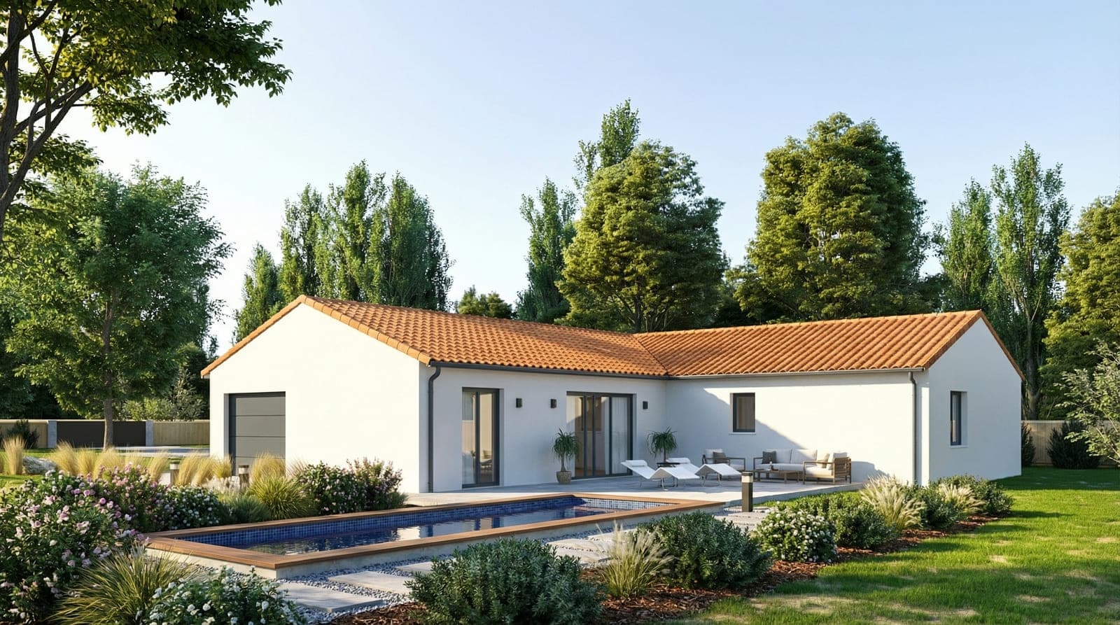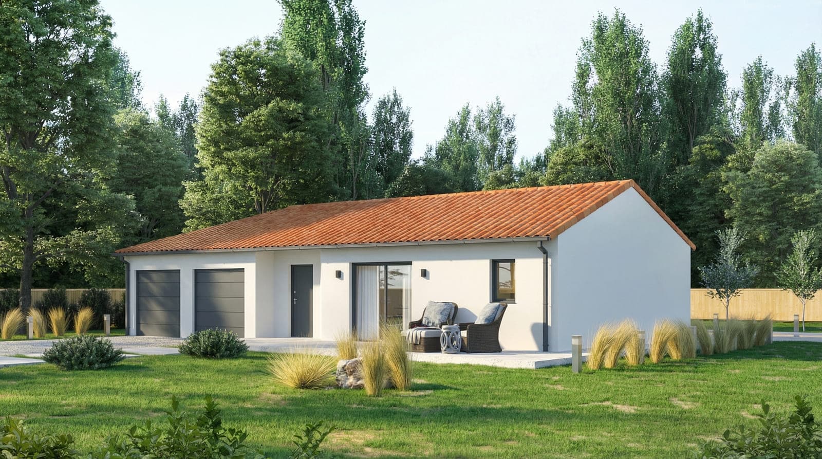 Un grand volume de vie tout ouvert avec une entrée protégée par un porche pour l’accueil. Plusieurs configurations possibles, 3 chambres ou 3 chambres avec une suite parentale ou encore une version 3 chambres avec un bureau. Vous pouvez personnaliser sans modération ce modèle et créer de nouvelles configurations de plans. Les volumes sont agréables et bien pensés. Une maison qui s’adapte sur beaucoup de terrains. Le garage pour une ou ou 2 voiture selon votre choix est attenant et communique avec l’habitation.