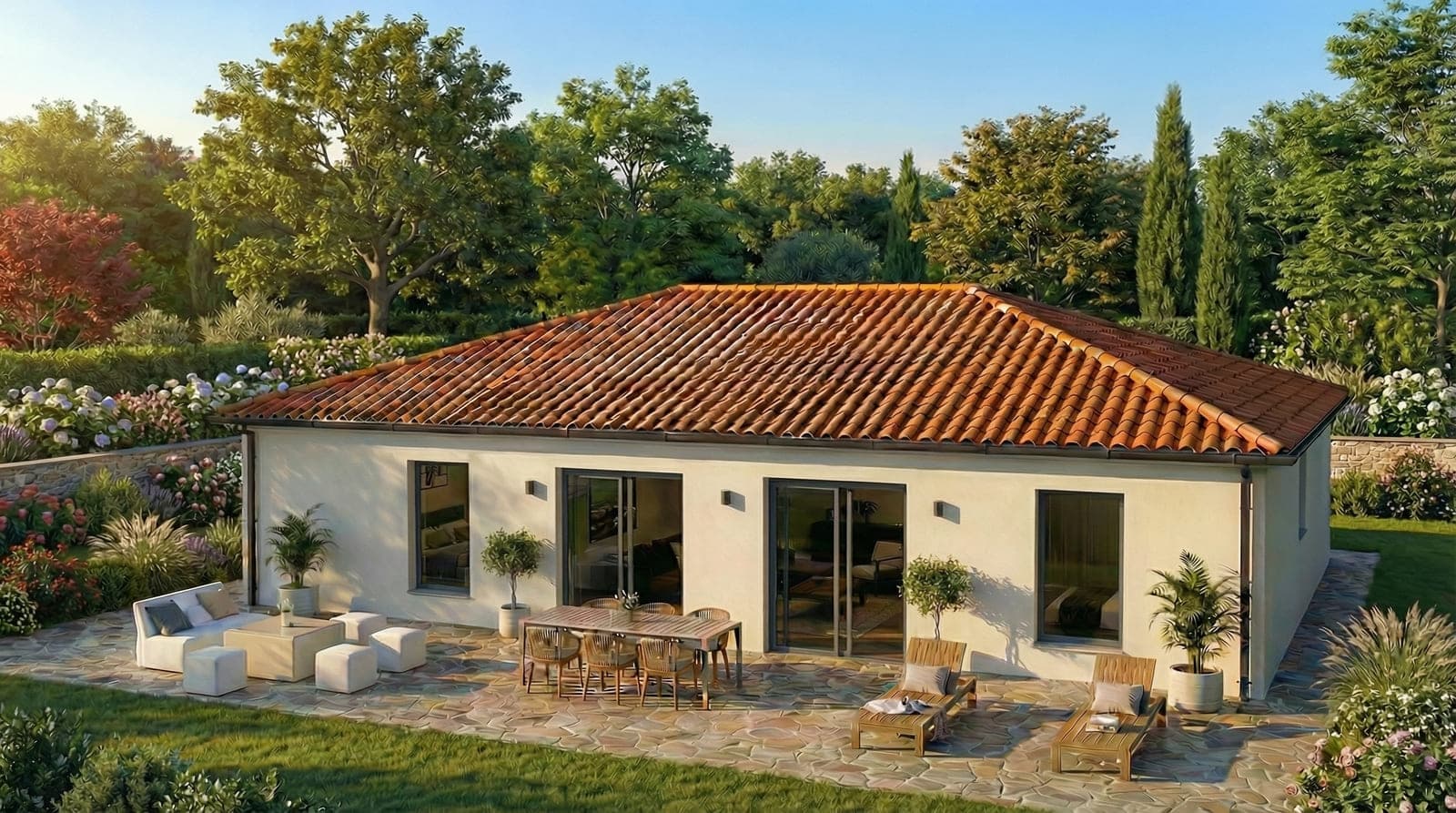 Pas de place perdue, toutes les pièces sont optimisée. La suite parentale est équipée d’une salle d’eau et d’un dressing. La maison avec son toit 4 pans et sa maçonnerie en forme de U donne une vrai identité à ce modèle qui en fait une maison parfaite.